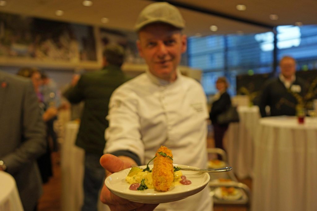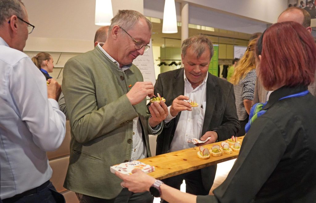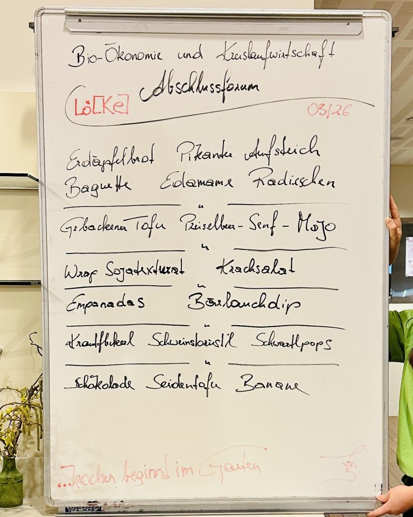 Geradezu bespielhaft für ein Essen mit Zukunft, waren dann die Schmankerln, die Küchenmeister Ferdinand Bauernhofer / Kochschule Löke den Teilnehmern des Abschlussforums servierte, kein Entweder Oder, sondern ein genüssliches Miteinander von neuen und traditionellen Leibspeisen: Brötchen mit Paprika-Tofu-Aufstrich und Edamame-Guacamole, Wraps mit Sojatexturat, Empanadas mit Bärlauch-Dipp, ausgebackener Tofu mit Kartoffelsalat und Preiselbeer-Senf-Mayo, Schweinsbrüstl mit Krautfleckerln und Schoko-Seidentofu-Bananen-Mousse.