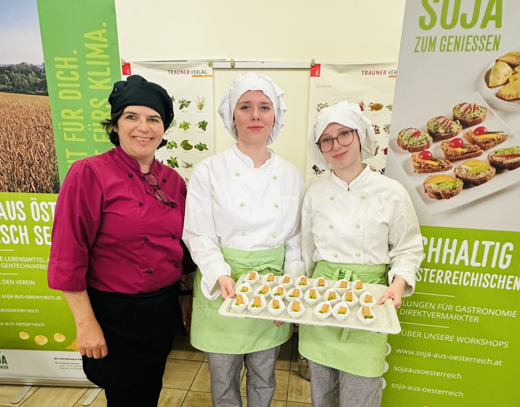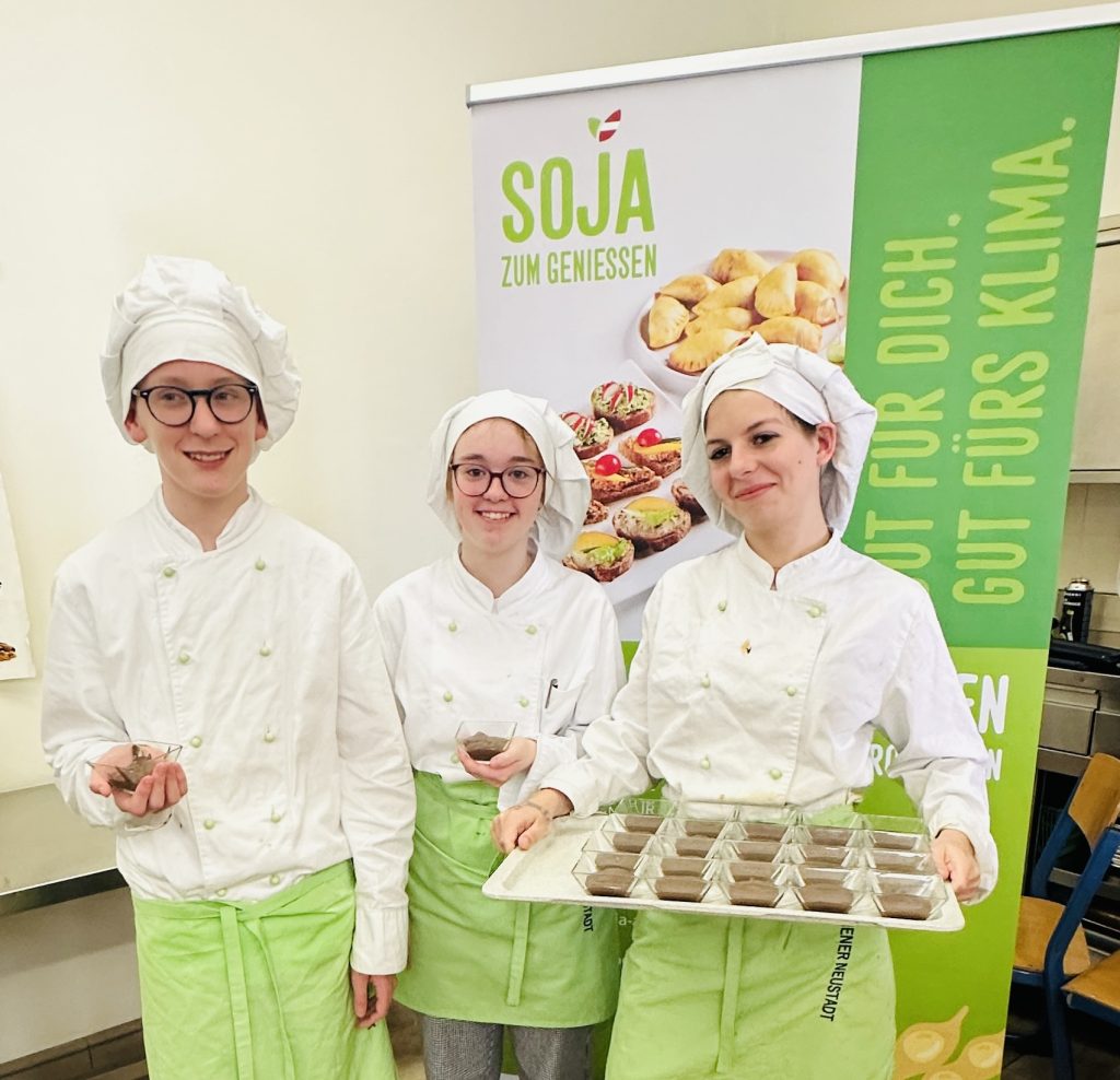 „Vegan und vegetarische Fachkraft“ als Zusatzqualifikation hatten die SchülerInnen gewählt, die an unserem Workshop am 8. April 2026 teilnahmen. Und weil zu dieser Ausbildung auch die „Nahrung für das Gehirn“ gehört, gab es zum Auftakt etwas Theorie: zur Bedeutung des österreichischen Sojaanbaus für Klima und Ernährungssicherheit sowie den Beitrag wenig verarbeiteter Sojaprodukte zu einer gesunden Ernährung.