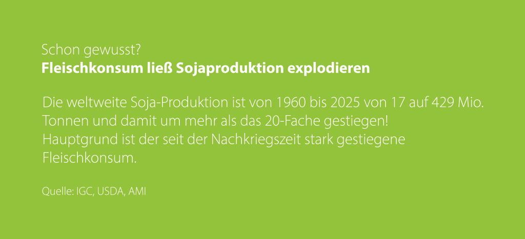 Die weltweite Soja-Produktion ist von 1960 bis 2021 von 17 auf 384 Mio. Tonnen und damit um mehr als das 20-Fache gestiegen! Hauptgrund ist der seit der Nachkriegszeit stark gestiegene Fleischkonsum.